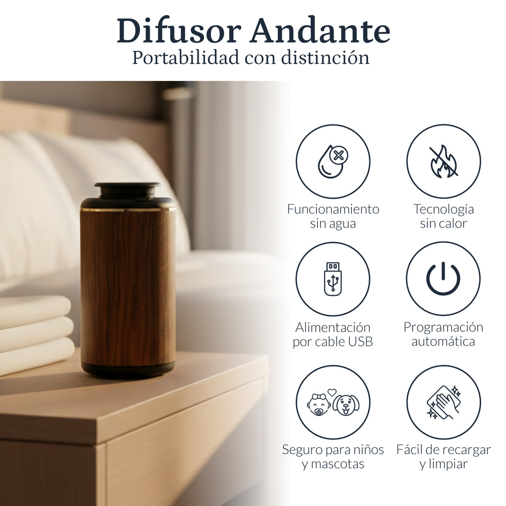 Si buscas mantener tu auto o tu área de trabajo con un aroma agradable todo el día, el Difusor Andante es tu mejor opción. Este difusor portátil recargable combina diseño moderno y tecnología de nebulización para ofrecer un aroma constante sin usar agua.