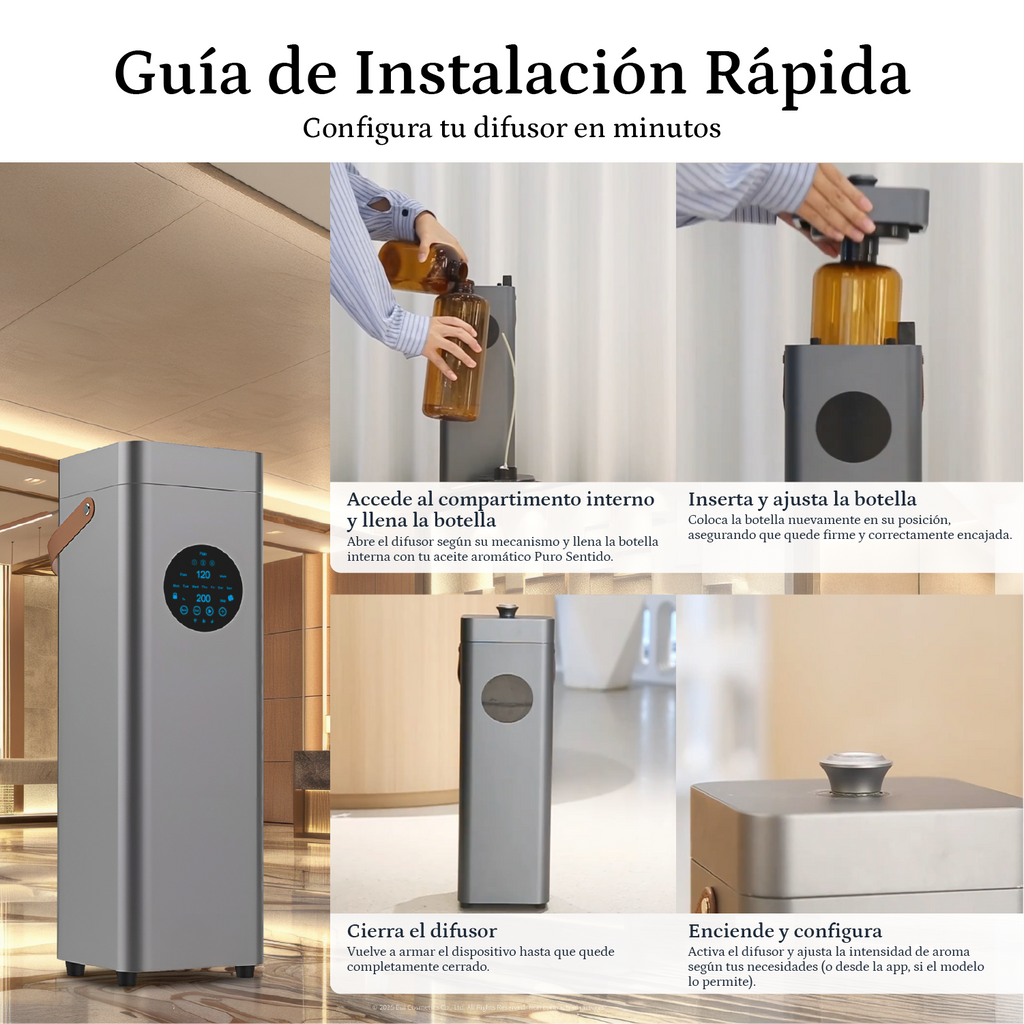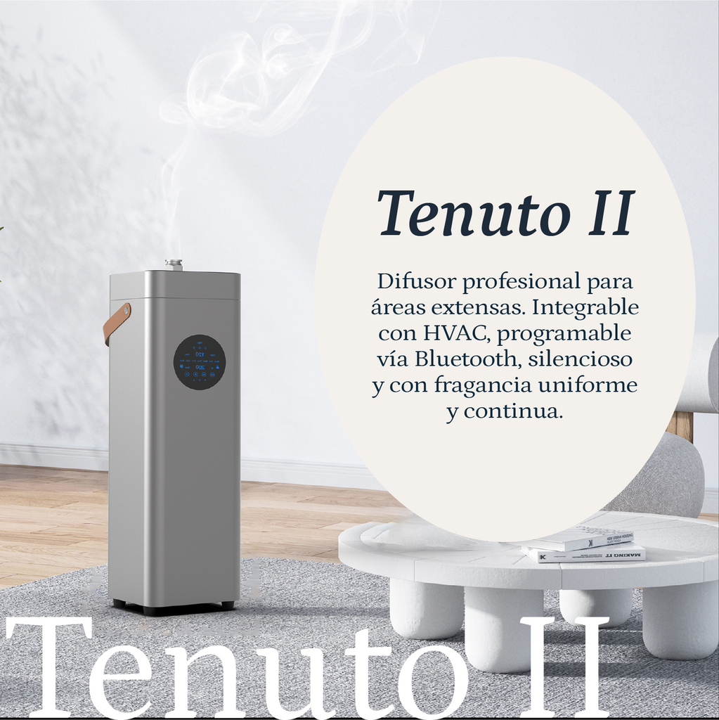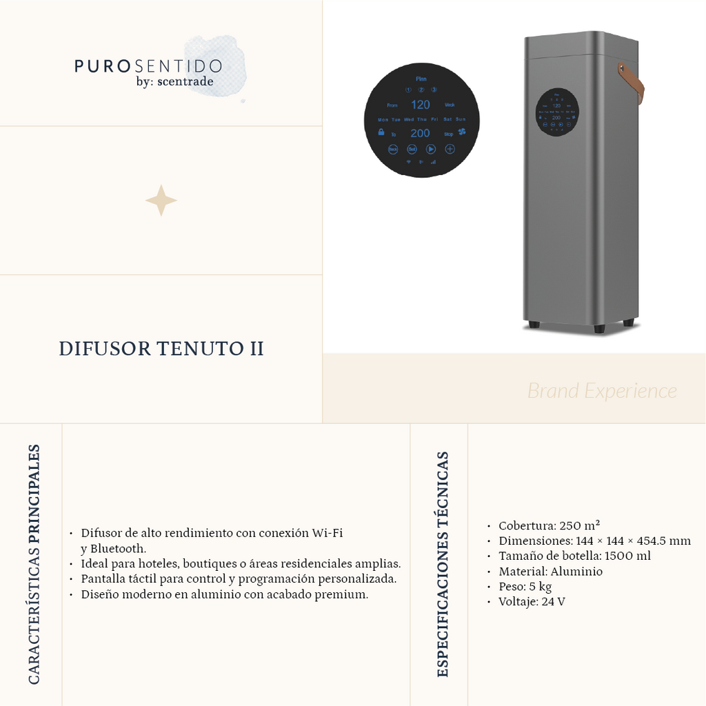 El Tenuto II de Puro Sentido es un difusor de alto rendimiento diseñado para quienes buscan un aroma profesional en espacios amplios. Con su estructura en aluminio y su tecnología de nebulización avanzada, es perfecto para negocios, hoteles, spas, oficinas grandes o casas amplias que requieren una fragancia constante y elegante.