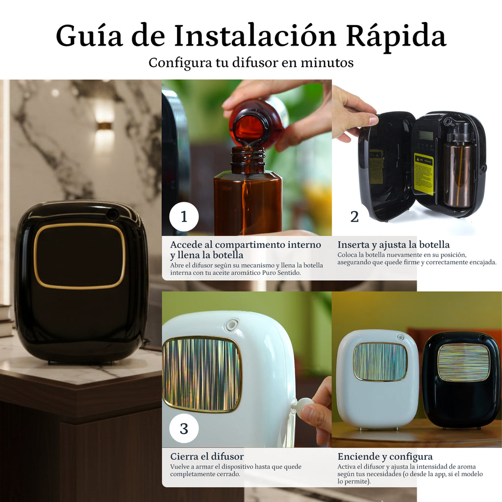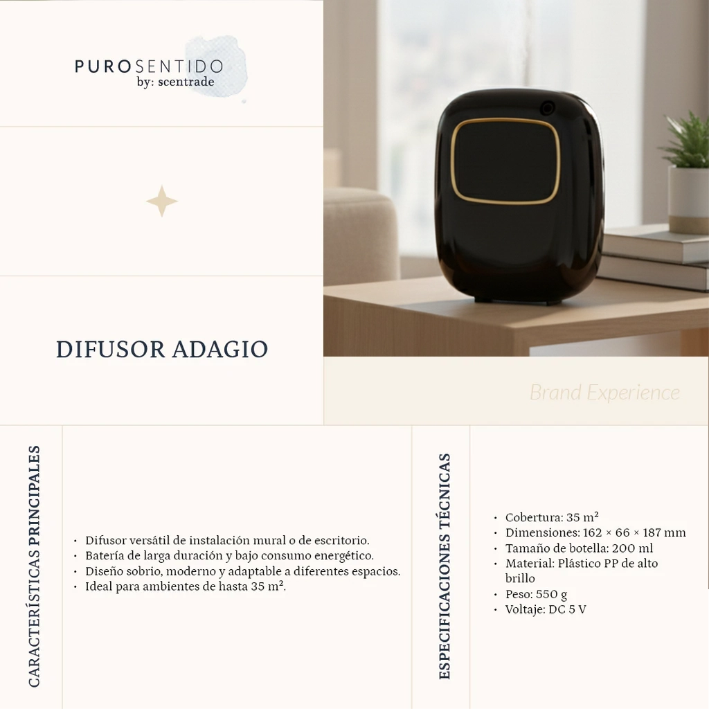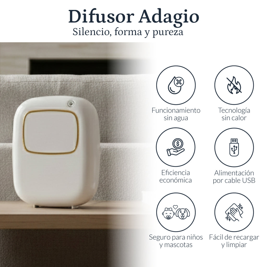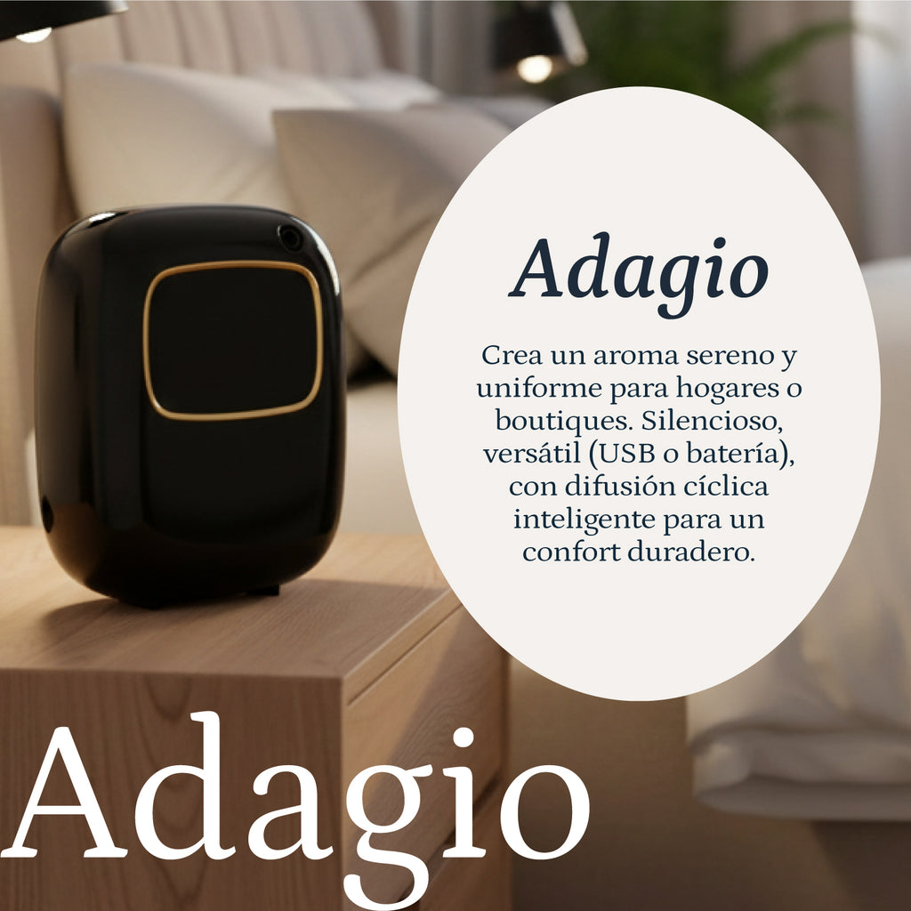 El Adagio es un difusor pensado para quienes desean mantener un ambiente agradable sin complicaciones. Con cobertura de hasta 35 m² y tecnología de nebulización avanzada, este modelo ofrece un aroma uniforme durante todo el día. Funciona con pilas o mediante cable USB, por lo que puedes usarlo en casa, en la oficina o en una boutique sin limitarte a un solo espacio.